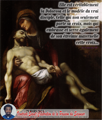 Le Catéchisme pourrait nous aider à méditer sur le mystère de ce Vendredi Saint lorsqu'il dit : « C’est "l’amour jusqu’à la fin" (Jn 13, 1) qui confère sa valeur de rédemption et de réparation, d’expiation et de satisfaction au sacrifice du Christ. Il nous a tous connus et aimés dans l’offrande de sa vie (cf. Ga 2, 20 ; Ep 5, 2. 25). "L’amour du Christ nous presse, à la pensée que, si un seul est mort pour tous, alors tous sont morts" (2 Co 5, 14). Aucun homme, fût-il le plus saint, n’était en mesure de prendre sur lui les péchés de tous les hommes et de s’offrir en sacrifice pour tous. L’existence dans le Christ de la Personne divine du Fils, qui dépasse et, en même temps, embrasse toutes les personnes humaines, et qui le constitue Tête de toute l’humanité, rend possible son sacrifice rédempteur pour tous. » CEC 616. Jésus consomme son sacrifice sur la croix. Comme lui, consommons aussi notre amour dans nos croix quotidiennes.